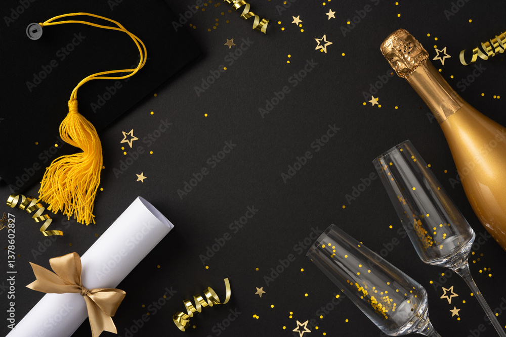 Elegant setup for a graduation party showcasing a diploma, cap, champagne, and decorations