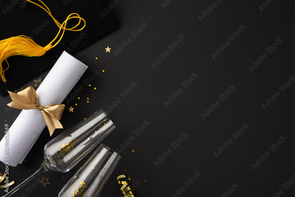 Graduation props including diploma and black cap with tassel contrasted against dark theme background