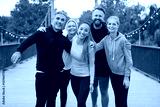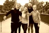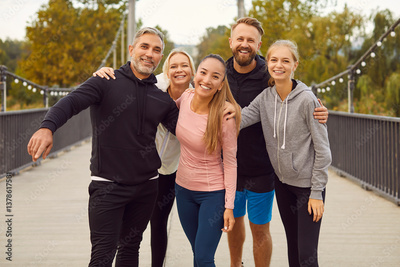 Portrait of happy sporty people wearing sportswear standing on bridge hugging and looking cheerful at camera after successful workout in park. Outdoors training and fitness in nature concept.
