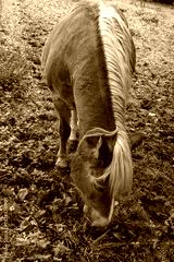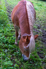 Beautiful brown Haflinger horse eating grass. Close-up, focus on horse's head and mane. Perfect for equine photography and animal portraits