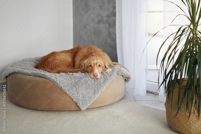 A Nova Scotia Duck Tolling Retriever sleeps curled up on a soft beige pet bed near a window.