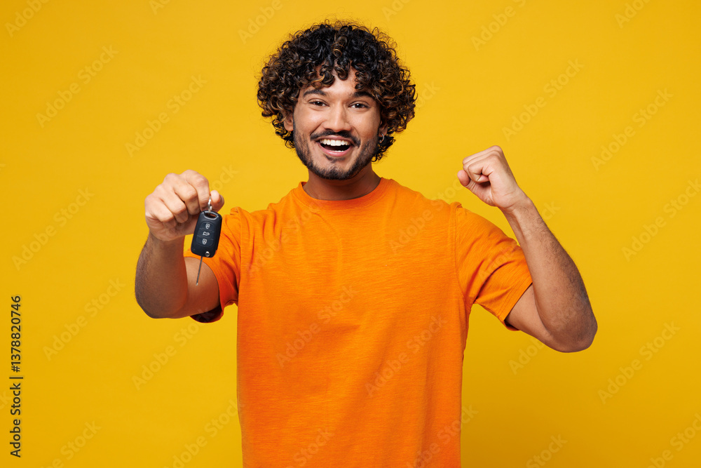 Young smiling fun happy Indian man he wear orange t-shirt casual clothes hold in hand car fob keyless system do winner gesture isolated on plain yellow background studio portrait. Lifestyle concept.