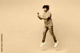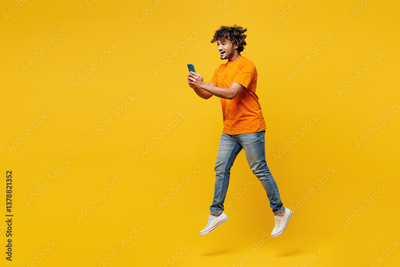 Full body side view young excited Indian man he wear orange t-shirt casual clothes jump high hold in hand use mobile cell phone isolated on plain yellow background studio portrait. Lifestyle concept.
