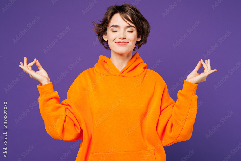 Young happy Caucasian woman she wearing orange hoody casual clothes hold spreading hands in yoga om aum gesture relax meditate try to calm down isolated on plain purple background. Lifestyle concept.