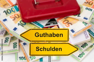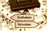 Vor einer Geldkassette mit vielen Bündel Euro Banknoten steht ein Wegweiser beschriftet mit Guthaben und Schulden - FOTOMONTAGE