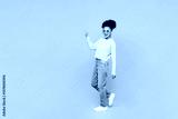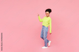 Full body young woman of African American ethnicity she wear green sweater casual clothes walk go point index finger aside on area mock up isolated on plain pastel pink background. Lifestyle concept.