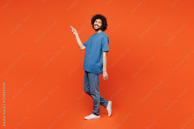 Full body side view fun young man of African American ethnicity he wear blue t-shirt casual clothes walk go point index finger aside on area isolated on plain red orange background. Lifestyle concept.