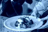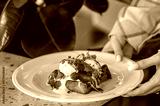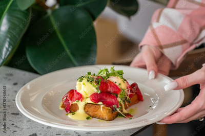 A person holds a white plate with a gourmet dish of poached eggs, hollandaise sauce, smoked salmon, microgreens, and toast. The background features green leaves and a grey speckled countertop.