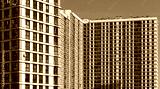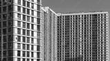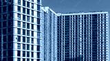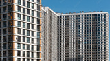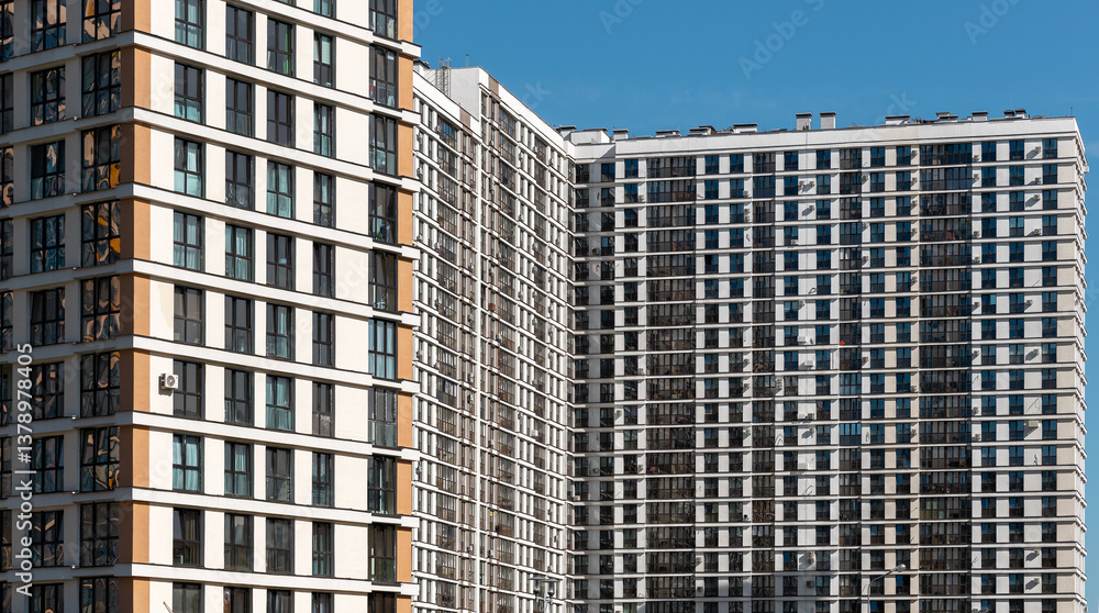 Building with modern architecture. Tall condominium block with window facade in urban neighborhood, downtown or metropolitan area, housing apartment for residential or commercial property. Clear sky..