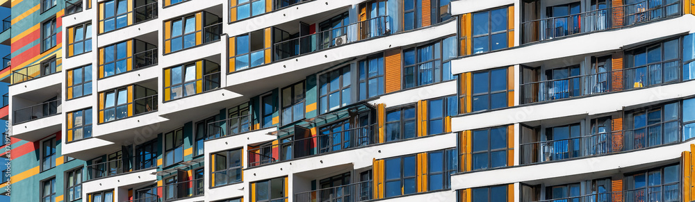 Building with modern architecture. Highrise condominium with multiple balcony pattern, window facade and tall structure for residential, commercial or real estate investment. Urban panoramic view..