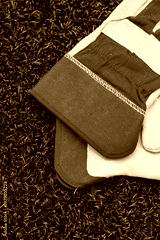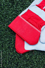 CloseUp View of EyeCatching Red and Grey Sports Gloves Resting on Artificial Grass Surface Perfect for Promotional Purposes of Athletic Gear and Engaging Sports Photography Imagery