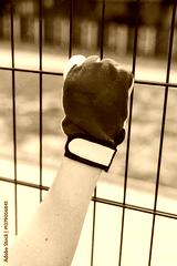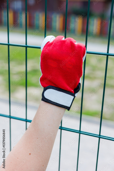 The image vividly displays a hand firmly gripping a vibrant green metal fence adorned with a striking red glove, capturing the exhilarating essence of an adventurous experience amidst natures beauty