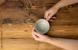 Hand Holds Cup, Empty Cup in Hands, Coffee Mug, Teacup Mockup, Cup in Arms on Wooden Table