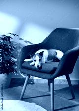 A Jack Russell Terrier lounges with legs extended on a grey chair under soft light near a potted plant.