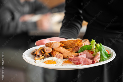 : A close-up of a plated breakfast featuring fried eggs, sausages, mushrooms, bacon, fresh salad greens, and toast, served on a wooden table with a blurred background.