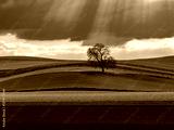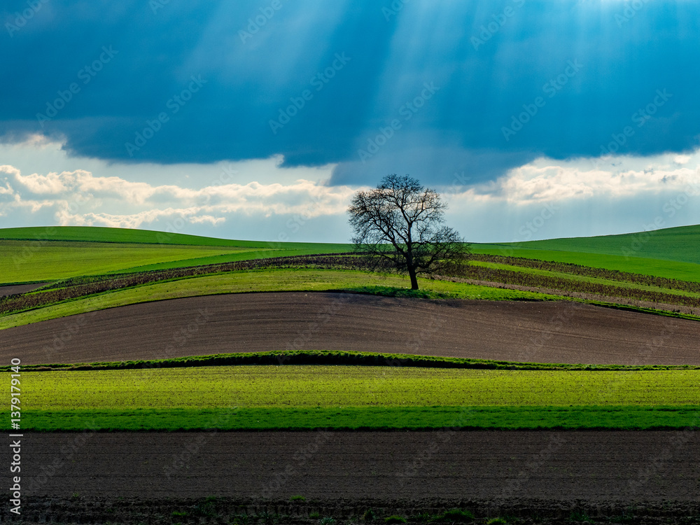 Hügellandschaft mit Lichtstrahlen im Frühjahr