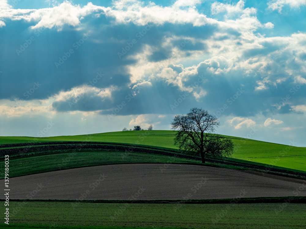 Hügellandschaft mit Lichtstrahlen im Frühjahr