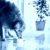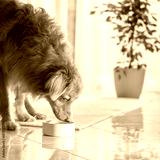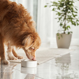 A Nova Scotia Duck Tolling Retriever lowers its head to sniff a small white bowl on a tiled surface in natural daylight.
