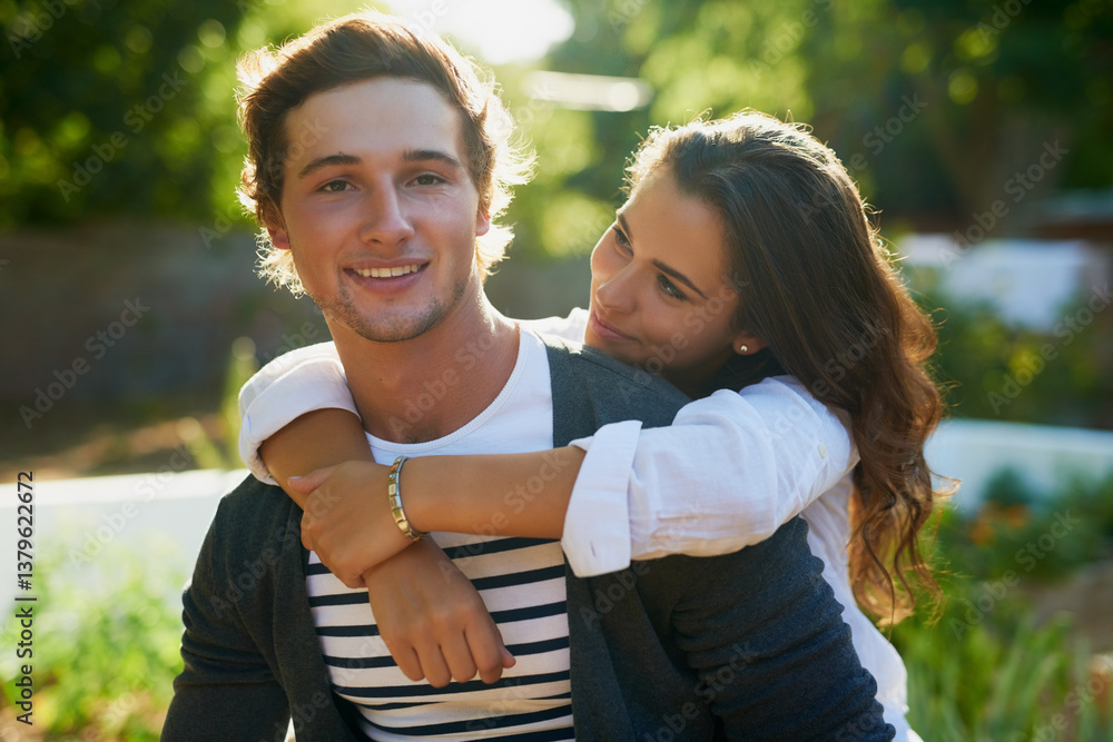 Couple, home and hug in garden on break with fun, happy and bonding for love in Spain. People, relationship and outside with smile for nature at backyard for support, care and trust as lovers