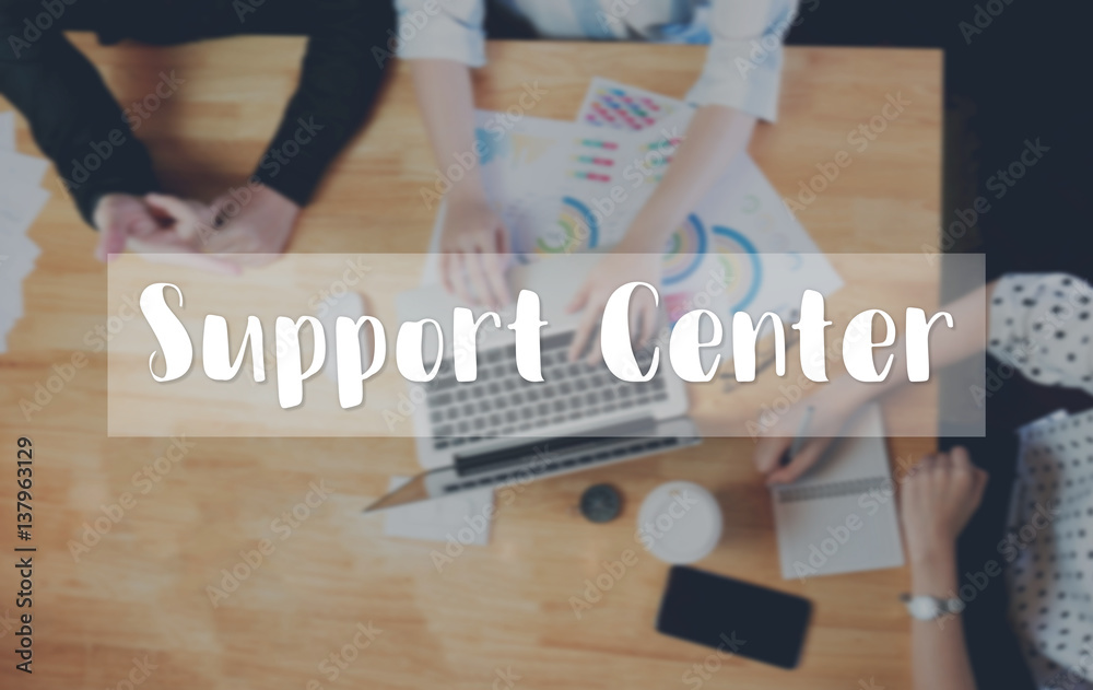 Support Center message on the device works the table background correspondence Customer Support Concept