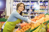 Smiling Saleswoman Arranging Oranges In Supermarket