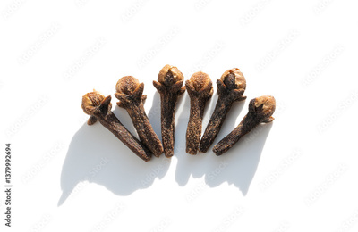 Clove spice with hard sun light isolated. Macro dry carnation spicy buds, natural Indian clove