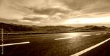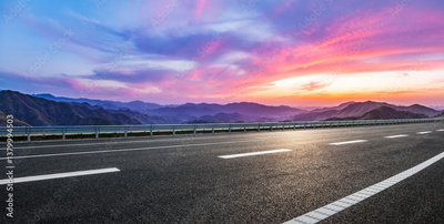 Empty asphalt highway leads towards stunning mountain range at colorful sunset