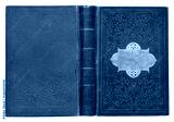 Old open blue book cover with embossed golden abstract pattern and floral decorations isolate on white background. Abstract vintage decorations 19th century.