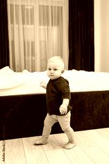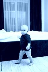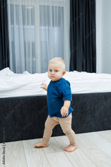 A cute toddler is happily walking around in a beautifully designed modern bedroom. These adorable moments encapsulate the essence of childhood, joyfulness, and exciting exploration of the home