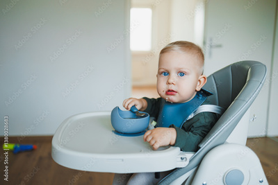 In a bright and minimalist home radiating warmth and joy, a cute little baby sits comfortably in a high chair, wearing an adorable blue bib as they happily enjoy a delightful snack from a bowl