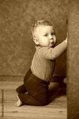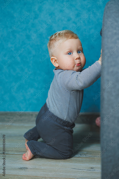 Adorable Baby Exploring and Learning to Stand, a Cute and Curious Child with Bright Blue Eyes Dressed in a Stylish Outfit on a Playful Background, Engaging in New Discoveries Every Day