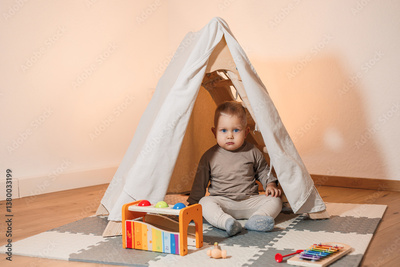 Delightful Indoor Playtime Moments A Happy Child is Enjoying a Cozy Tent Filled with Colorful Toys, Engaging in Various Imaginative Activities that Bring Unmatched Joy and Pure Happiness