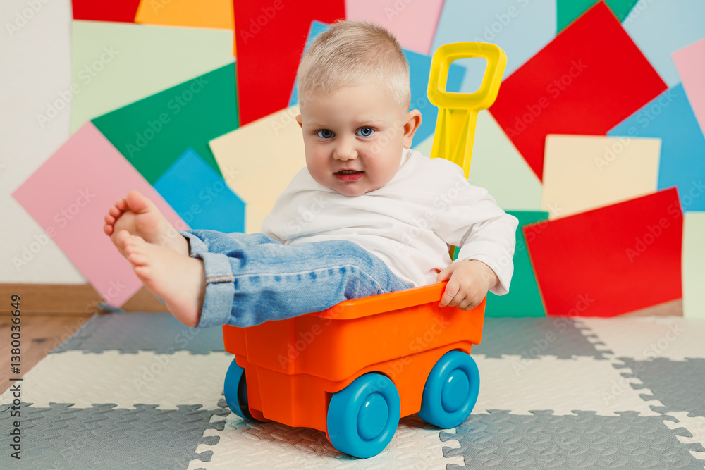 A cheerful toddler plays with a colorful toy cart, immersed in an imaginative world against a lively backdrop, capturing the essence of childhood playfulness during these early life moments
