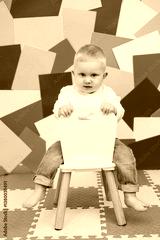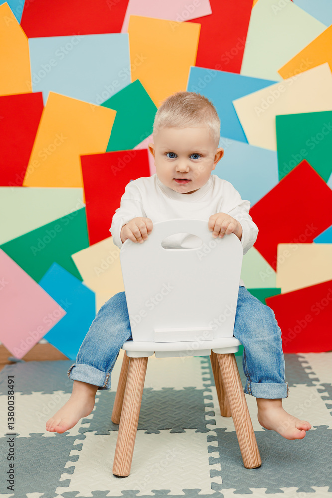 A Charming and Adorable Toddler is Sitting Comfortably on a Chair, Surrounded by a Bright and Colorful Background Which Creates an Engaging Atmosphere Filled with Joy, Laughter, and Fun