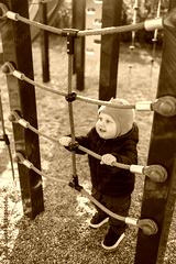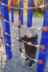 An adorable toddler is joyfully playing on a colorful climbing structure at a vibrant playground, basking in the bright sunlight, and experiencing the wonders of childhood exploration and adventure
