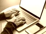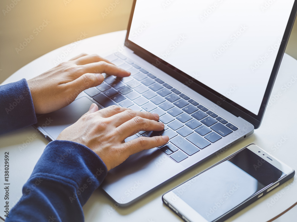 Woman hand type on Laptop Keyboard with smart phone Business concept