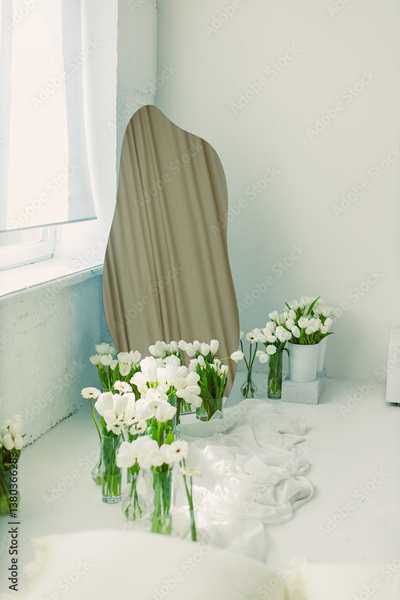 This elegantly designed minimalist room features a stunning curved mirror that enhances the space, complemented by fresh white flowers adding a touch of natural freshness to the decor