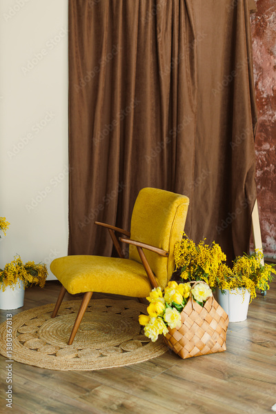 Chic Retro Corner A Cozy Yellow Chair is Gracefully Surrounded by Fresh Spring Flowers in a Beautifully Styled Interior, Perfectly Complemented for an Inviting Atmosphere for All Photography Lovers
