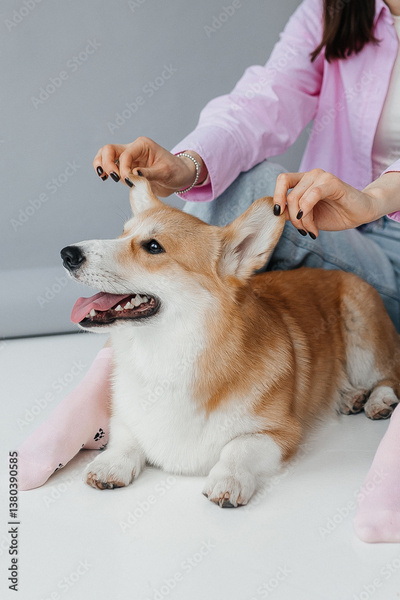 A playful and delightful corgi is thoroughly enjoying a gentle grooming session, lovingly provided by its owner, all while in a cozy and inviting indoor setting that feels warm and welcoming