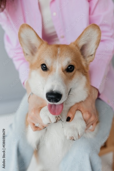 In a delightful cozy home, a cheerful Corgi dog is being playfully cuddled by its loving owner, showcasing their strong and warm bond filled with joy, companionship, and mutual affection