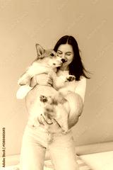 A Joyful Moment A delighted woman joyfully cradles an adorable corgi in a cozy indoor setting filled with warmth and happiness, highlighting the cherished companionship and friendship between them