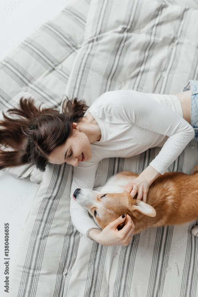 Joyful bonding moments Young woman playing with her cheerful corgi on a cozy blanket in a serene setting