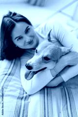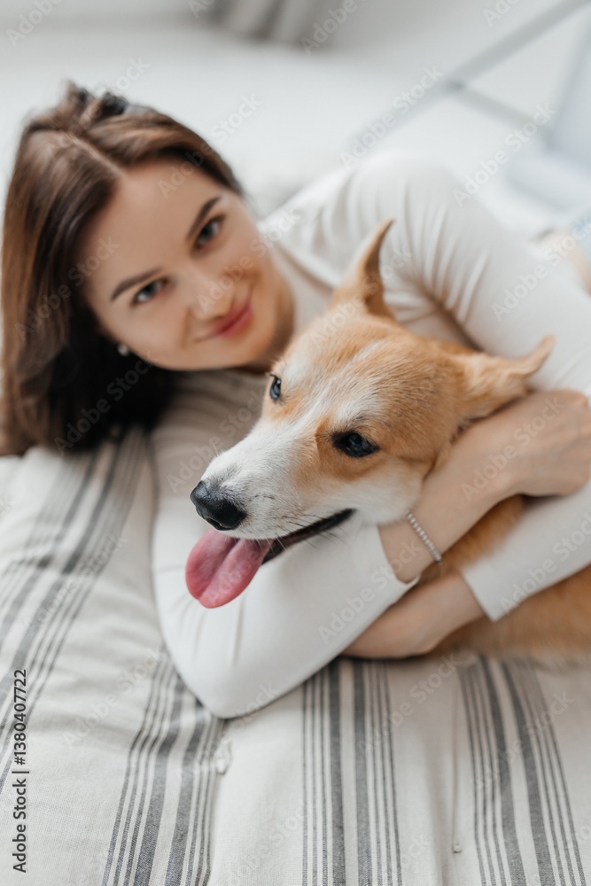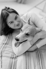 In a warm, cozy home, a young woman joyfully embraces her playful and adorable dog, showcasing their strong bond that brings them daily happiness, affection, and warmth to enrich their lives together