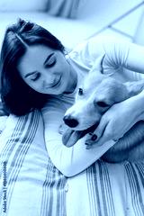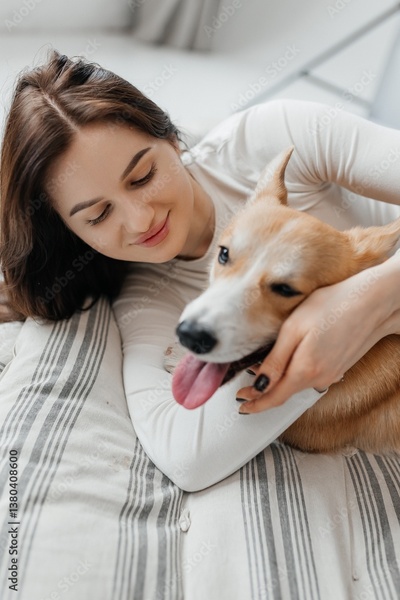 A Joyful Moment A Young Woman Delightfully Enjoying a Heartwarming Affectionate Time with Her Adorable Corgi on a Cozy, Comfortable Bed Surrounded by Soft Blankets and Loving Atmosphere