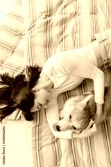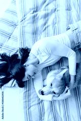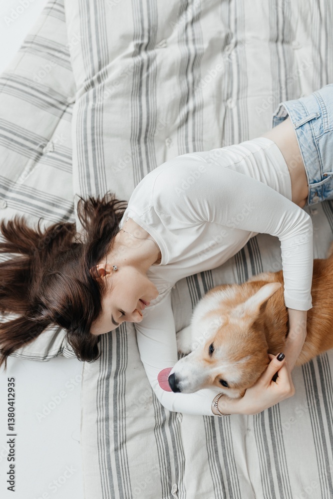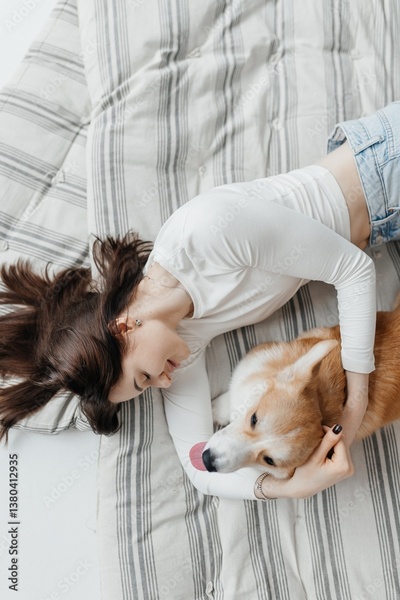 Warm and Heartfelt Bonding Moments A Young Woman Cuddles Up with Her Adorable Dog on a Cozy Bed, Enjoying the Joy of Companionship in a Peaceful Indoor Setting, Filled with Love and Tenderness