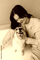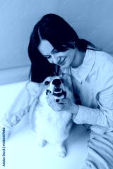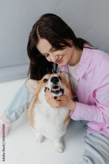 In a warm and cozy space of her home, a young woman is joyfully enjoying a delightful moment with her adorable Corgi, celebrating the love and happiness they share during their playful time together
