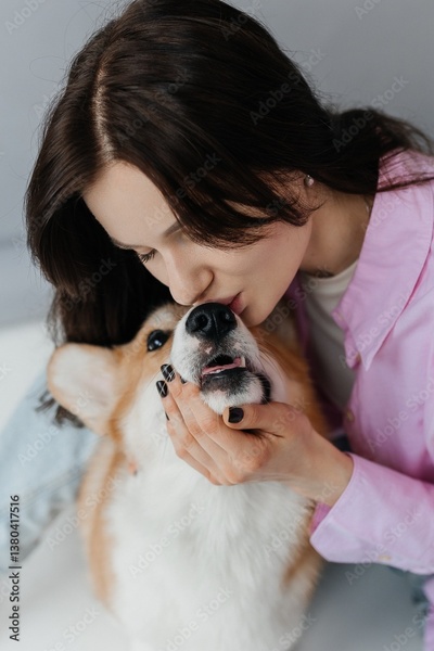 In a heartwarming and memorable moment, a woman shares a gentle kiss with her utterly adorable corgi companion, enveloped in a cozy and inviting indoor setting that radiates warmth and affection