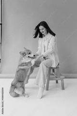 In a colorful studio, a young woman and her playful corgi enjoy delightful activities that showcase their strong bond and affection, overflowing with joy and creating unforgettable memories