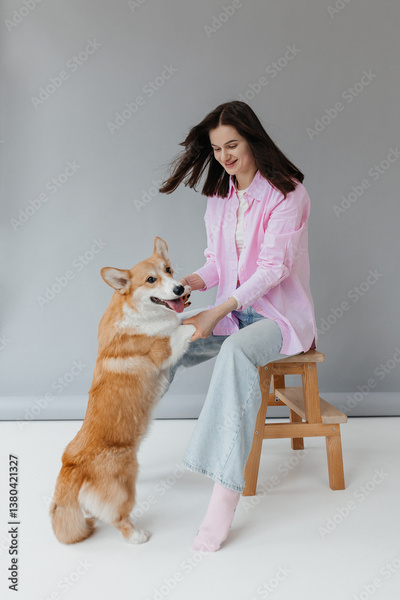 Joyful Moment A Woman Savoring Quality Playtime with Her Delightfully Happy Corgi in a Bright, Stylish Studio Setting that Captures the Essence of Fun and Companionship between Them