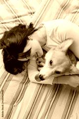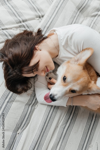 A Heartwarming and Joyful Bonding Moment A Woman Happily Embracing Her Adorable Corgi on a Cozy Bed, Surrounded by Soft Bedding in a Peaceful and Inviting Bedroom Space, Radiating Love and Happiness